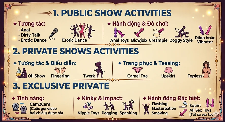 肛交, 后庭玩具, 口交, 体内射精, 假阳具或震动器, 下流話, 狗式, 色情舞, 阴部骆驼趾, 指交, 精油表演, 电臀舞, 裙底风光, 赤裸上身, 快闪裸体, 自慰, 乳头玩具, 假阴茎肛交, 性玩具, 洗澡, 抽烟, 鞭打, 潮吹